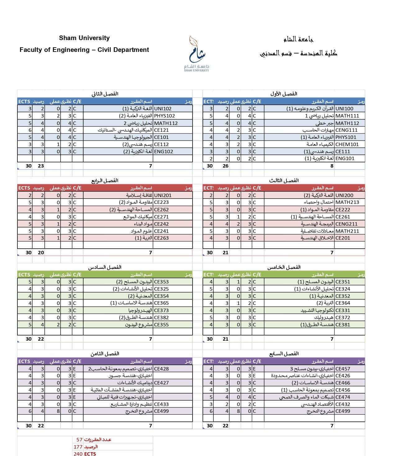 يهدف قسم الهندسة المدنية بجامعة الشام العالمية إلى تحقيق مستوى أكاديمي راقي لتخريج مهندس متميز قادر على التعامل مع مشاريع البنى التحتية والتطوير العمراني التي تلبي الاحتياجات المستمرة لبناء وتطوير المدن وتساهم في التنمية المستدامة في سوريا المستقبل. ويسعى القسم إلى تطوير البحوث التي ينفذها إلى نواحي تطبيقية تساهم في خدمة المجتمع والاستفادة المثلى من موارده. كذلك نسعى نحو رعاية وتشجيع مناخ أكاديمي يمكن الطالب من تنمية القدرة على الابتكار وتعلم الأخلاقيات والآداب المهنية والإحساس بالمسئولية تجاه المجتمع.